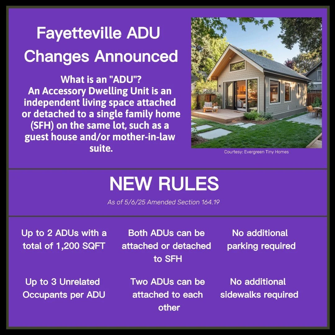 Fayetteville City Council amended the rules governing Accessory Dwelling Units (ADU) May 6th, 2025. The changes give homeowners new options for investment income as well as a means to accommodate multi-generational households.